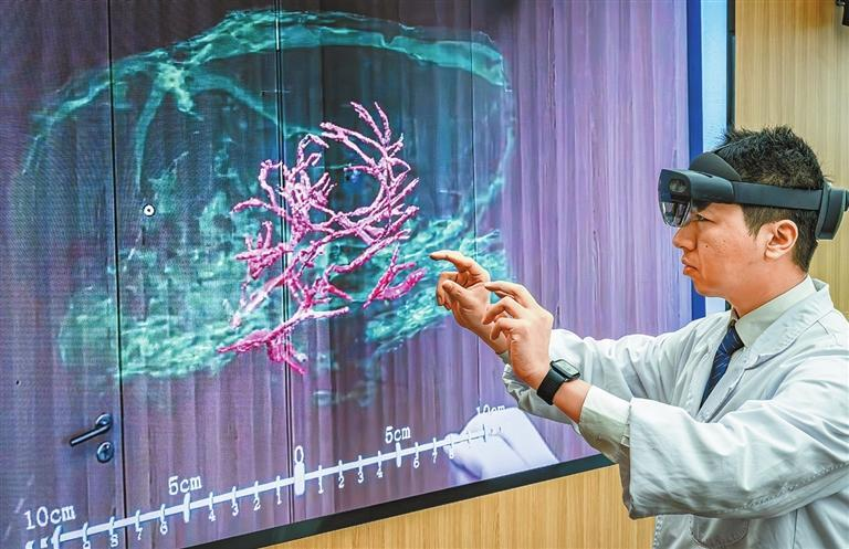 2025년 3월 26일 촬영된 자료 사진에서 한 연구원이 혼합현실(MR) 기술과 결합된 마이크로미터급 뇌-컴퓨터 인터페이스(BCI) 응용 기술을 시연하고 있다. 신화통신